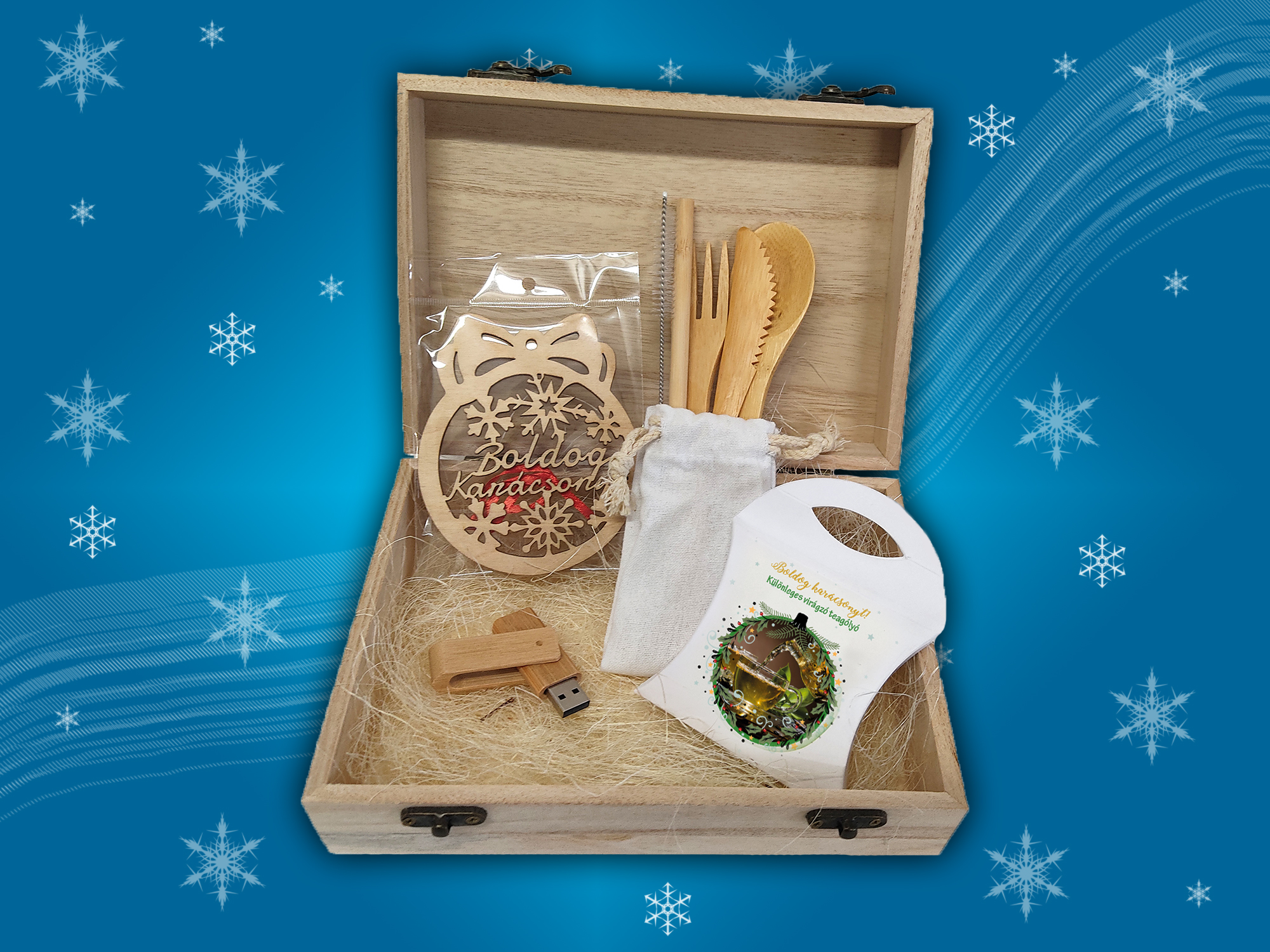 Íme a karácsonyi ajándékötlet, amely minden eleme használható. A doboz, amiben a meglepetéseket zártuk elegáns, később tökéletes tárolásra, a bambusz evőeszköz készlet elegáns és bármilyen étkezést feldob, a virágzó tea (melyből valódi tea készíthető) gyönyörű meglepetés, a karácsonyfadísz tökéletes a fára, a bambusz pendrive pedig a munkához. Tökéletes karácsonyi ajándék, aminek örülni fog, lepd meg vele!