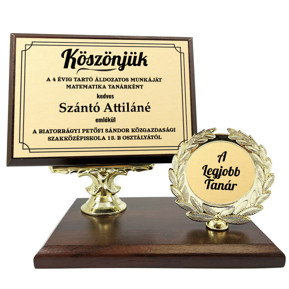 Anyaga: Fa, fém plakett, arany színű műgyanta szobor Talpazat mérete: 18 x 12,5 x 2,5 Plakett mérete: 15 x 10 cm Teljes magasság: 19,5 cm Szobor magassága: 10,5 cm |