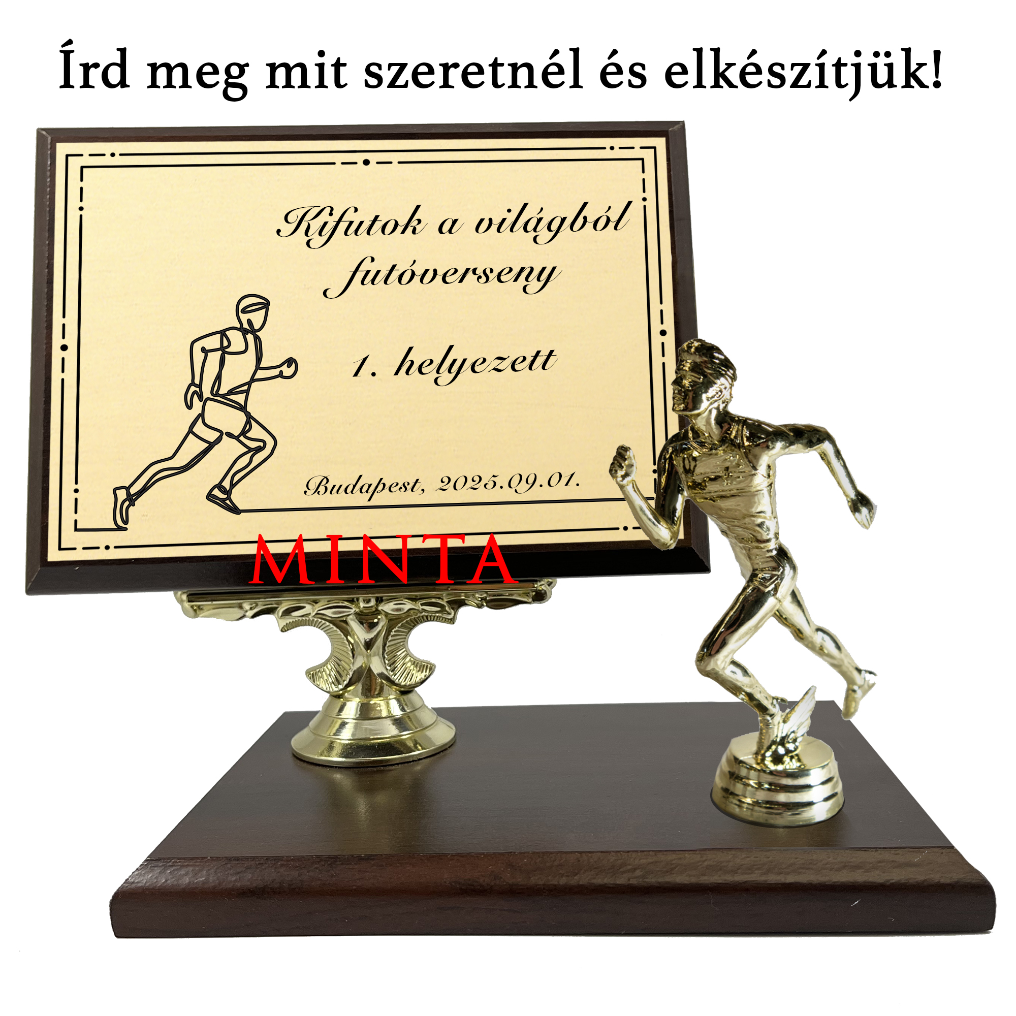 Anyaga: Fa, fém plakett, műanyag, aranyozott bevonatú szobor Talpazat mérete: 18 x 12,5 x 2,5 Plakett mérete: 15 x 10 cm Teljes magasság: 19,5 cm Szobor magassága: 13 cm |