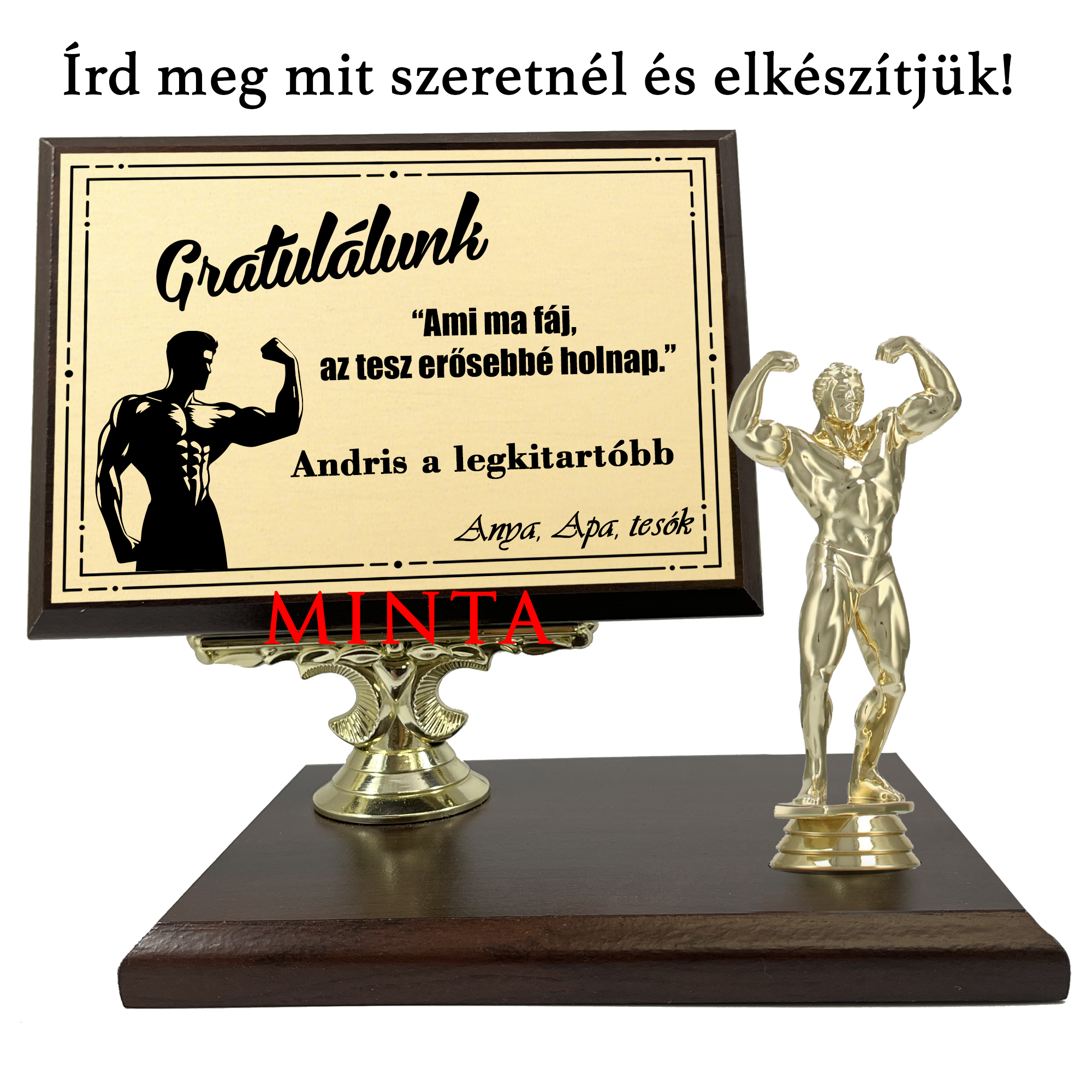 Anyaga: Fa, fém plakett, műanyag, aranyozott bevonatú szobor Talpazat mérete: 18 x 12,5 x 2,5 Plakett mérete: 15 x 10 cm Teljes magasság: 19,5 cm Szobor magassága: 13 cm |