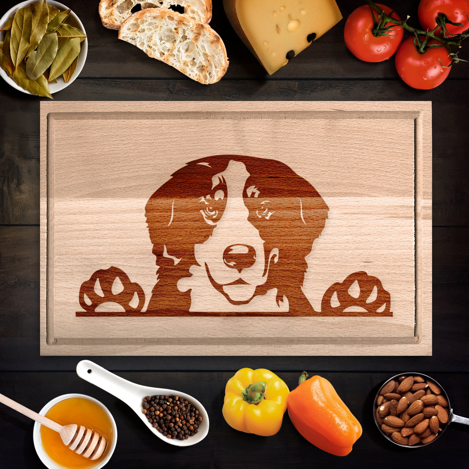 A berni pásztorkutya családi kutya, aki egész életében hűségesen áll szerettei oldalán, ezért mindig ellágyulunk, ha meglátjuk. A vágódeszka díszeként is előhozhatja szívmelengető emlékeinket és élményeinket, ezért jó ajándékötlet a gazdiknak. Használhatják eredeti funkciójaként gyümölcs-, zöldség- vagy éppen hússzeletelésre is, de puszta dekorációként is megállja a helyét.