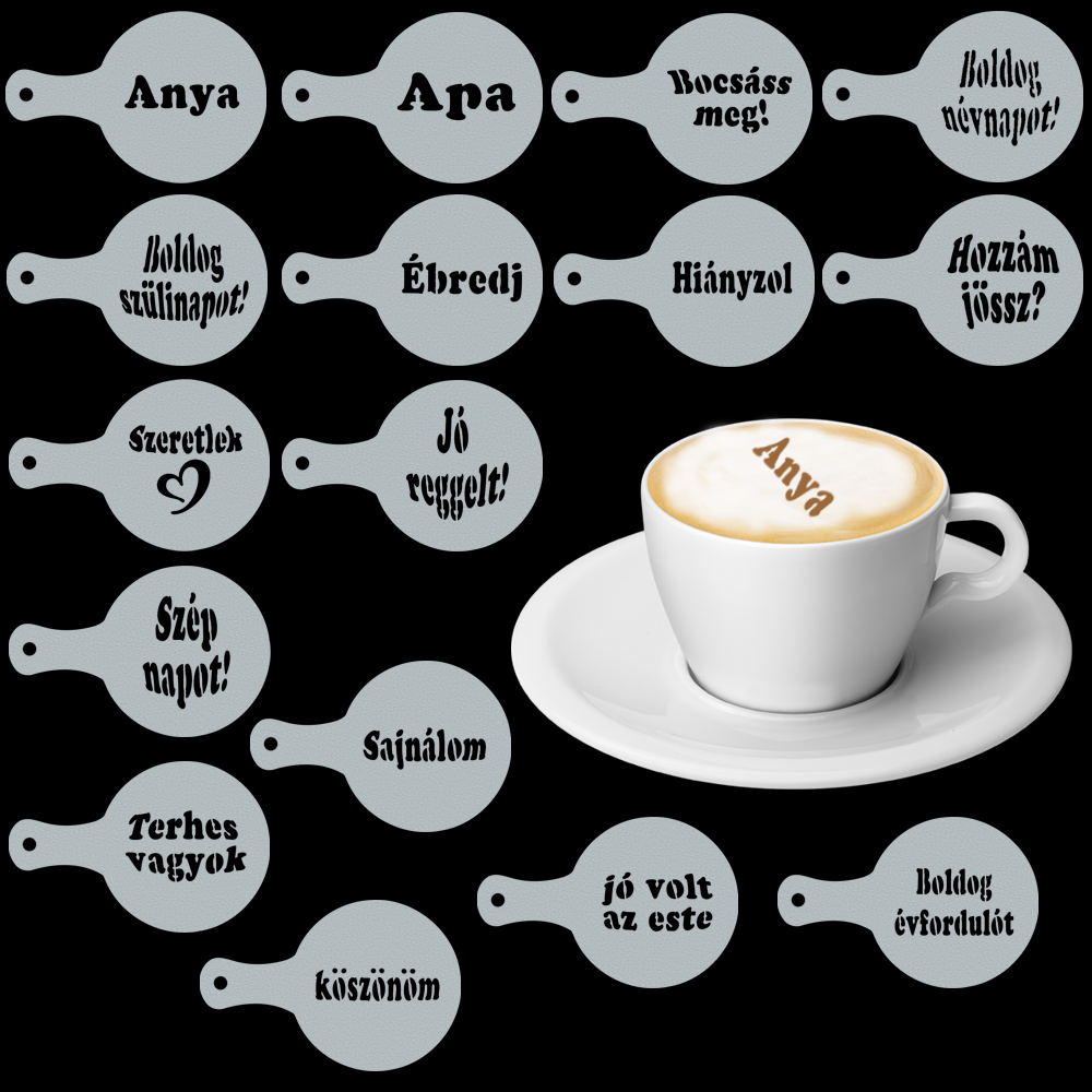 Induljon a reggel egy kedves üzenettel! A 16 darabos szettnek köszönhetően mindig a megfelelő szöveget varázsolhatod a reggeli kávé, cappuccino tetejére. Ha személyesen nem is tudod elmondani, ezentúl egy finom kávéval fejezheted ki szerelmedet, bocsánatkérésedet, vagy akár a lánykérésben is segítségére lehet a félénkebb, visszafogottabb Uraknak! Válaszd a cappuccino és kávé díszítő szöveges sablonokat születésnapra, névnapra, karácsonyra, bármilyen alkalomra és a siker garantáltan nem marad el!