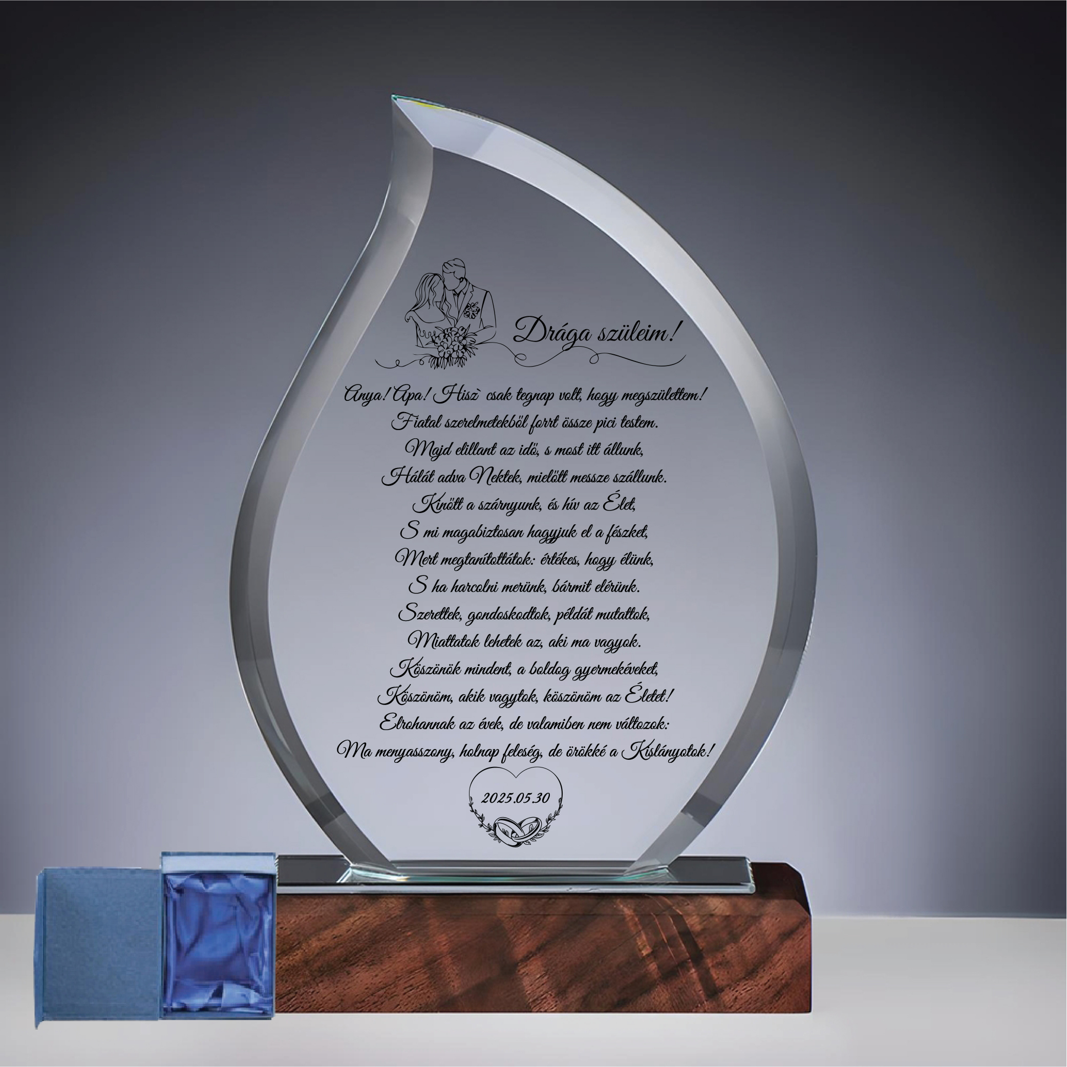Modern és látványos üvegdíj, aminek a felületére feliratokat és emblémákat is tudunk gravírozni. Anyaga: üvegkristály + fa talpazat Díszdobozban adjuk