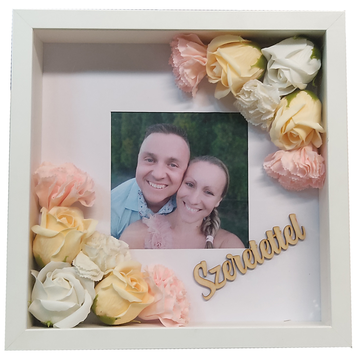 Anyaga: fa, műanyag, szappanvirág A képkeret mérete: 25 cm X 25 cm Választható fa felirattal: Szeretettel - Szeretlek - Boldog születésnapot - Boldog névnapot - Boldog anyák napját  |
