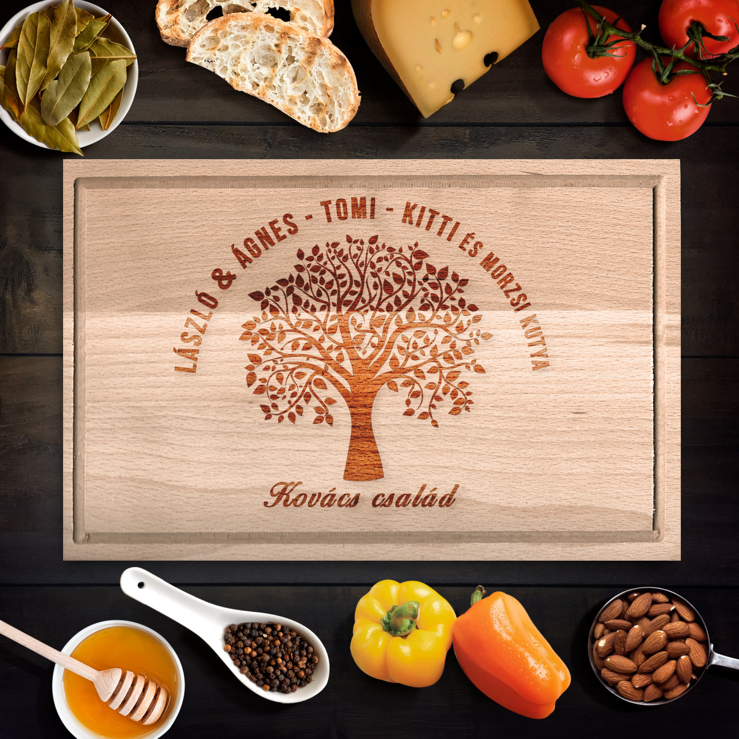 Vedd le a lábáról az egész családot, ezzel a nem mindennapi konyhai kiegészítővel! Egyedi vágódeszka, mely nem csak praktikus ajándék ötlet, de ugyanakkor igazán különleges ékévé válhat minden otthonnak, gyönyörű családfa mintájának köszönhetően! Kérd saját nevekkel, becenevekkel, csak a fantázia szab határt! Férfiaknak, nőknek, nagyszülőknek egyaránt szuper választás! Ajándékozd meg vele szeretteidet születésnapra, névnapra, karácsonyra, anyák- vagy apák napja alkalmával, a hatás garantáltan nem marad el! Rendeld meg bátran, különböző méretekben!