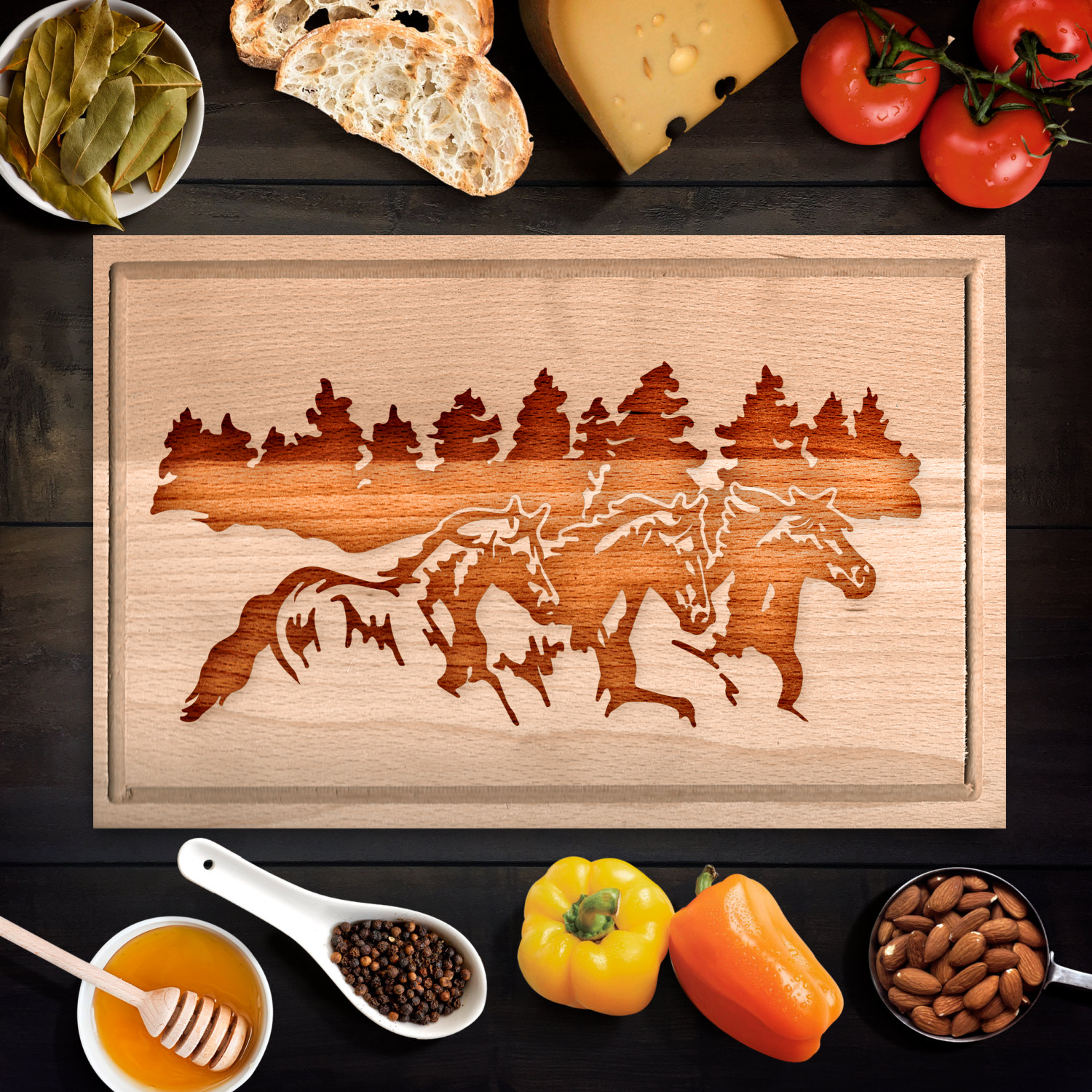 Ebből az egyedi vágódeszkából négyféle méretet is rendelhetsz, így akár minden funkcióhoz alkalmas szettet is ajándékozhatsz. A vadlovakkal díszített bükkfa deszka, amely lórajongóknak éppúgy kedves ajándékötlet, mint a rusztikus lakberendezés kedvelőinek, minden alkalommal felvidíthatja az ünnepeltet.
