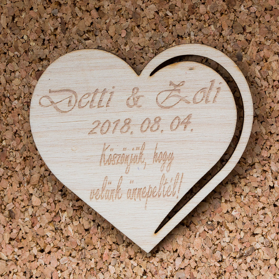 Háláld meg stílusosan barátaidnak, családtagjaidnak, az együtt eltöltött boldog perceket, ennek a szuper köszönőajándéknak a segítségével! Mi más fejezné ki jobban az egymás iránt érzett szerelmeteket, mint egy szív alakú köszönőajándék? Kérd saját nevetekkel és esküvőtök dátumával, vagy akár hűtőmágnesként és lepd meg szeretteidet egy igazán különleges emlékkel! Nem csak praktikus ajándék ötlet, de ugyanakkor igazán egyedi választás is ez a nem mindennapi szuvenír! Minden lagzin garantáltan megállja a helyét, annak stílusától függetlenül!