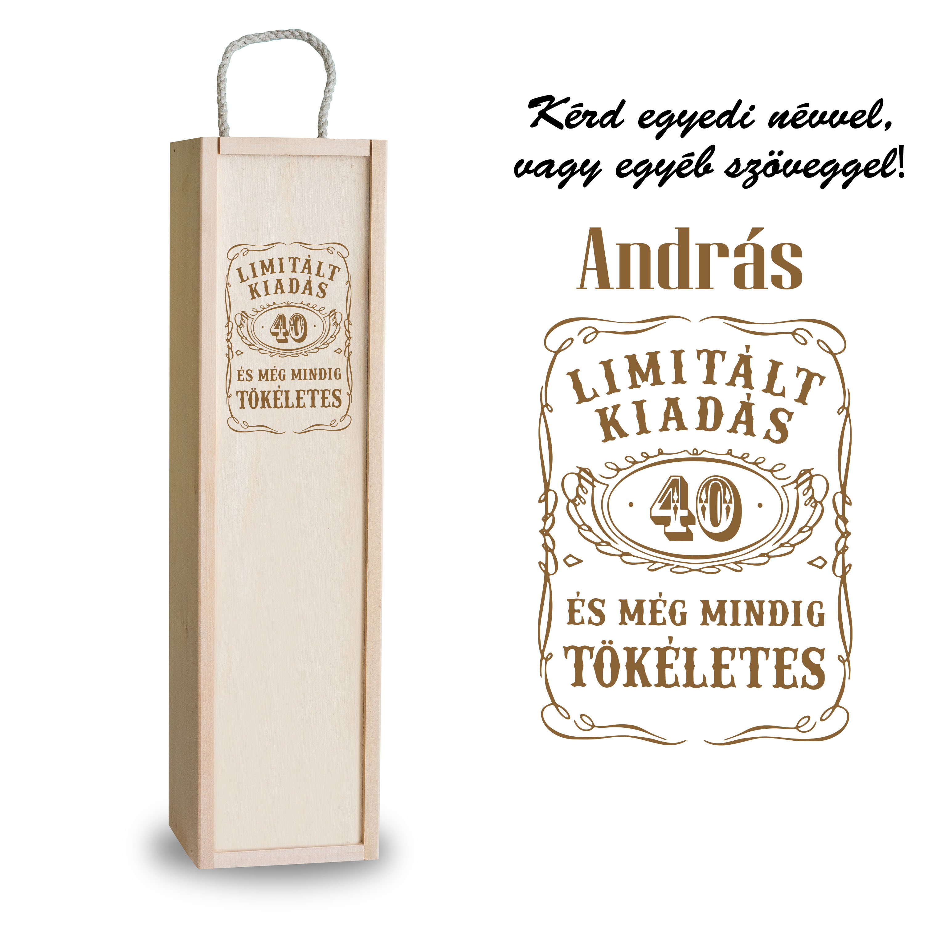 Vannak olyan – kerek vagy emlékezetes – születésnapok, amelyek fontosabbak, mint az átlagos, nagyobb ünneplést és jobb hangulatot várnak el. A 40. születésnap ilyen. Lepd meg a 40 éves születésnapost egy fából készült, gravírozott, születésnapi bortartóval. Még személyesebbé teheted az ajándékot, ha belegravíroztatod a megajándékozott nevét és beszerzed hozzá a kedvenc borát, amit elrejthetsz a bortartóba. (Ha igazán szereti a bort, szerezd meg neki a kivételesen izgalmas dupla bortartós változatot). Csapj le rá most imádni fogja.