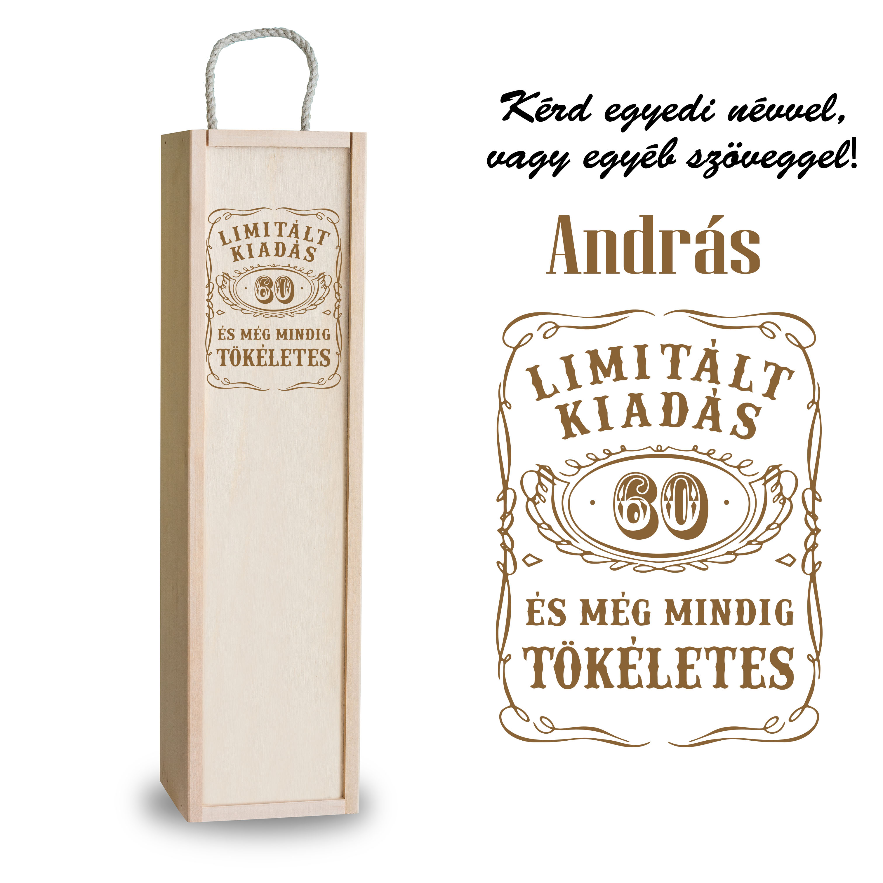 A fa bortartó doboz egy kiváló ajándék ötlet azoknak, akik szeretik a finom borokat és az igazán stílusos ajándékokat. Egyedi gravírozás kérésével személyre szabható, így még különlegesebb ajándékká válik a 60-dik születésnapra. Az elegáns design és a bájos felirat a dobozt különleges stílusúvá, és emlékezetes ajándékká varázsolja. Lepd meg őt a hatvanadik születésnapján egy kiváló üveg borral, és add át neki ebben a gyönyörű díszdobozban. Biztos lehetsz benne, hogy ezzel a bortartó dobozzal örömteli és emlékezetes születésnapi meglepetéssel ajándékozod meg.
