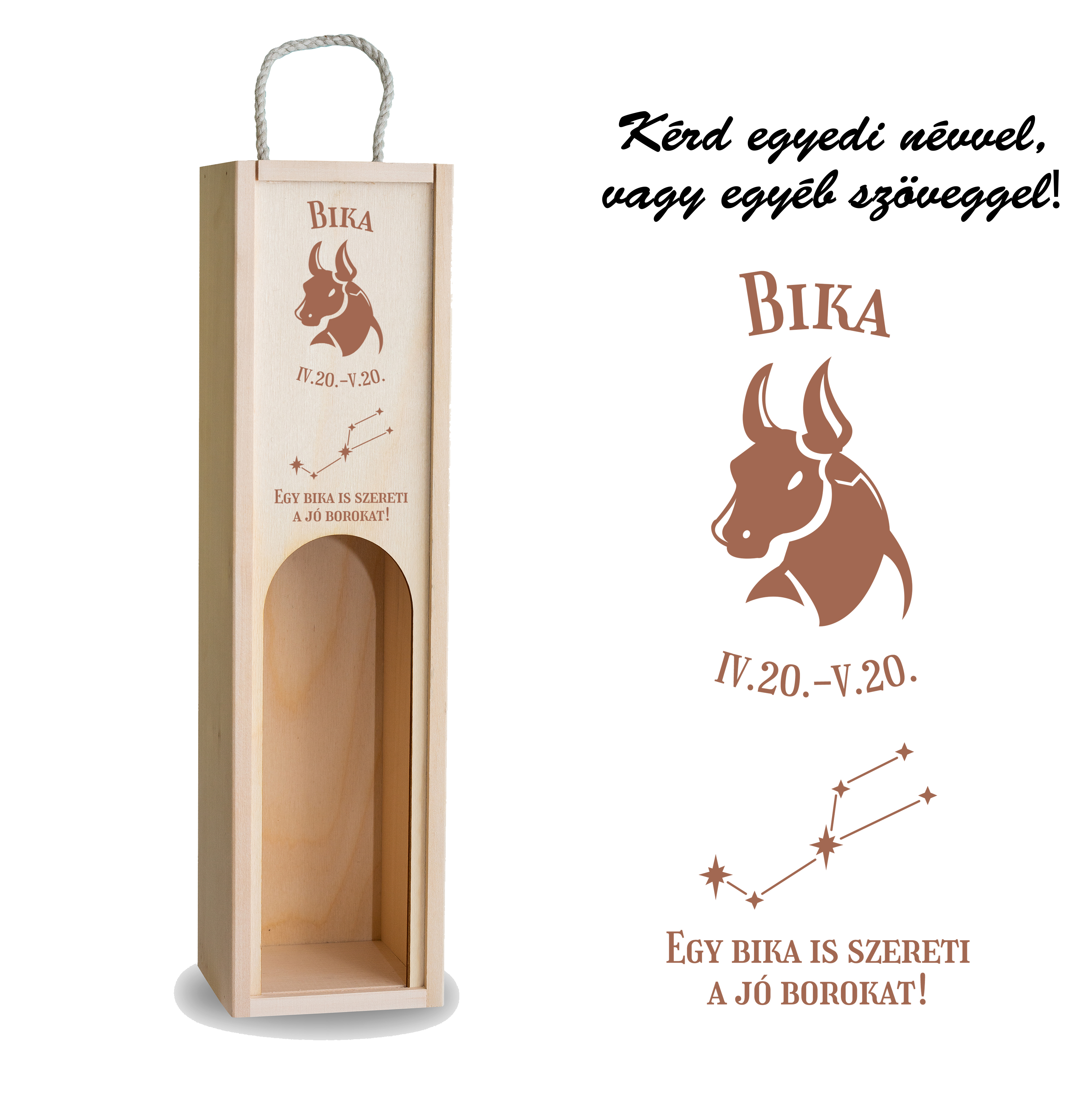Legyen szó születésnapról, horoszkóp szerinti ajándékról vagy bármilyen különleges alkalomról, a Fa bortartó doboz - Bika mindig a figyelmed középpontjában áll. Ajándékozz minőséget és emlékezetes pillanatokat ezzel a stílusos és egyedi bortartóval! Válaszd az ajándék ötletet, ami garantáltan örömet és élvezetet hoz az ünnepeltnek!