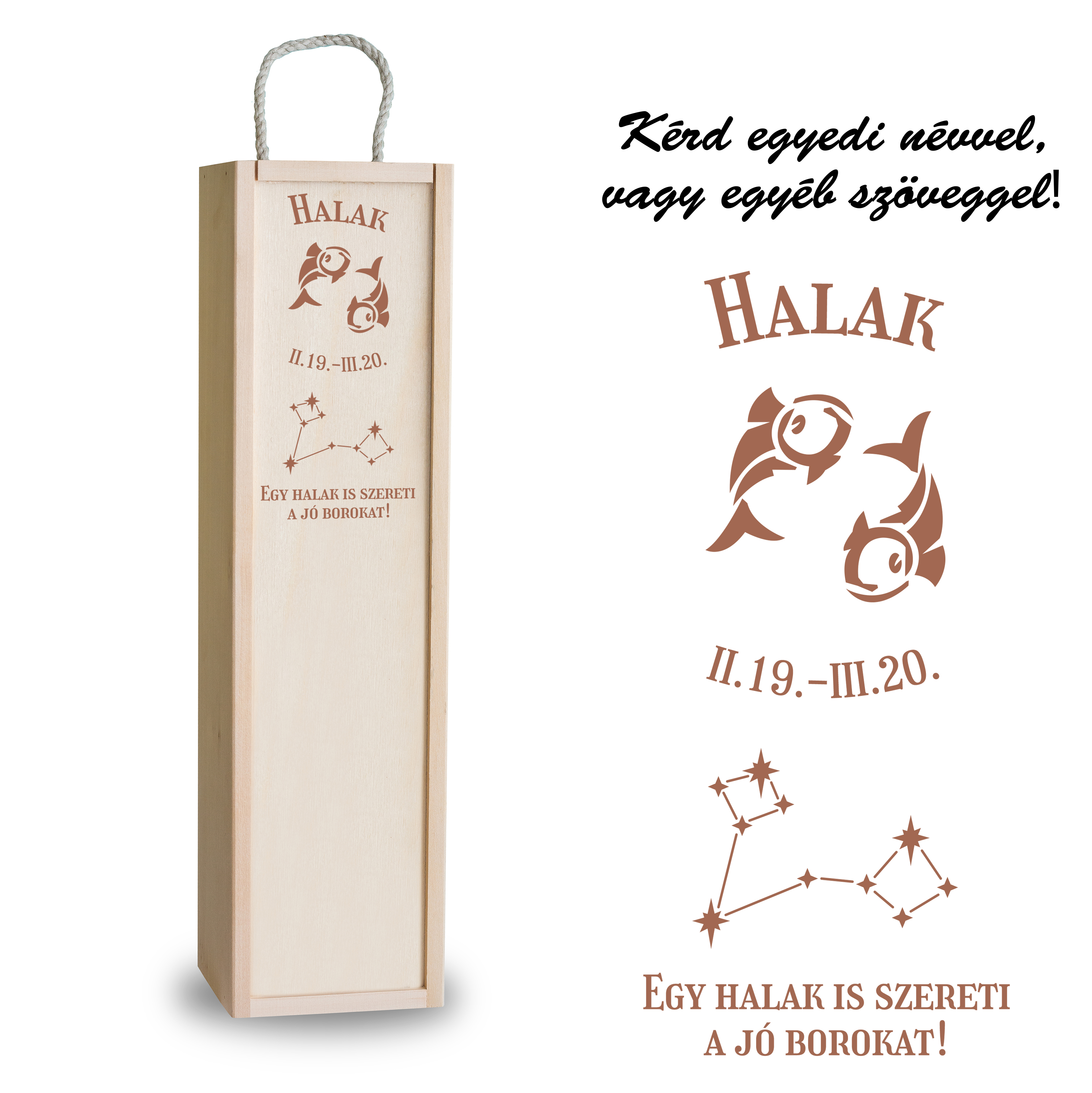 A Halak jegyhez tartozó Fa bortartó doboz egyedi és személyes ajándék, ami kifejezi a figyelmedet és szeretetedet az ajándékadó felé. A Halak jegyhez gyakran társítják az érzékenységet és a kreativitást, így ez a bortartó tökéletesen illik a Halak jegyűek személyiségéhez.