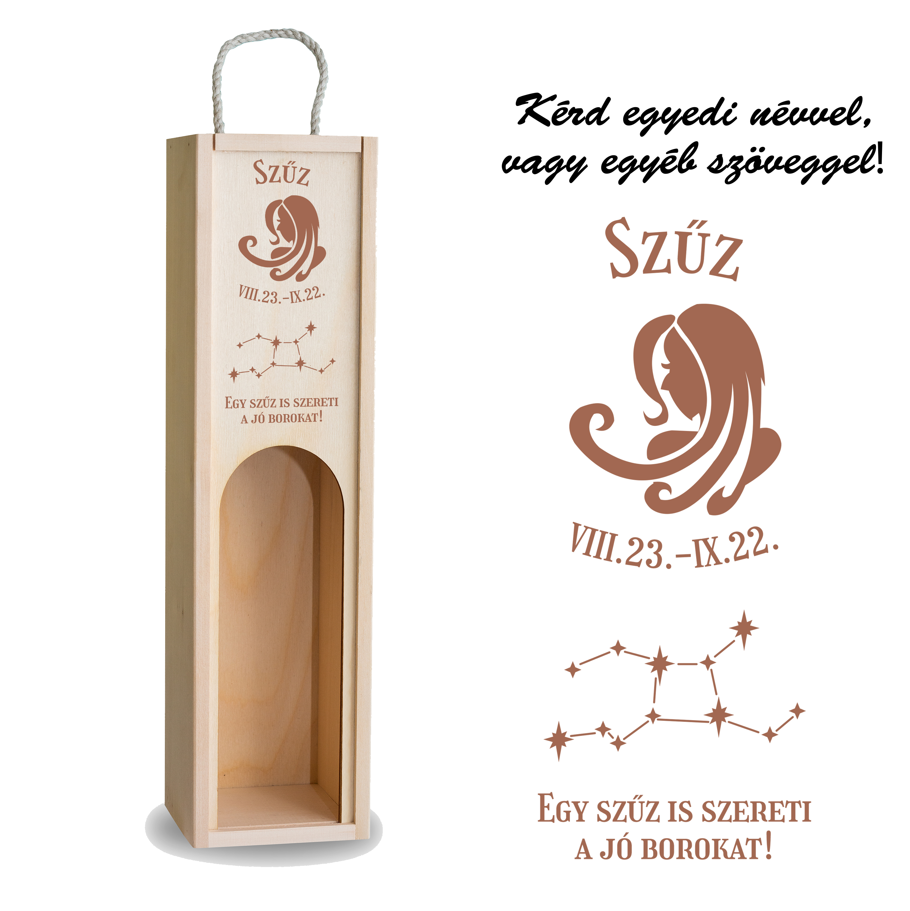 A Szűz motívummal díszített Fa bortartó doboz egyedi és személyes ajándék, ami kifejezi a figyelmedet és szeretetedet az ajándékozott felé. A szűz jegyhez gyakran társítják a precizitást és a gondoskodást, így ez a bortartó tökéletesen illik a szűz jegyűek személyiségéhez.