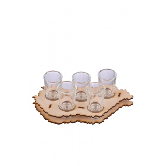 Méretei: 22 cm x 10 cm x 2 cm Anyaga: fa + üveg 5 db üveg pohár, melynek mérete: 7 cm x 4 cm. Űrtartalma: 4 cl |
