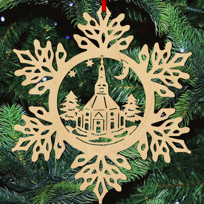 Fa karácsonyfadísz – Hópehely templommal
