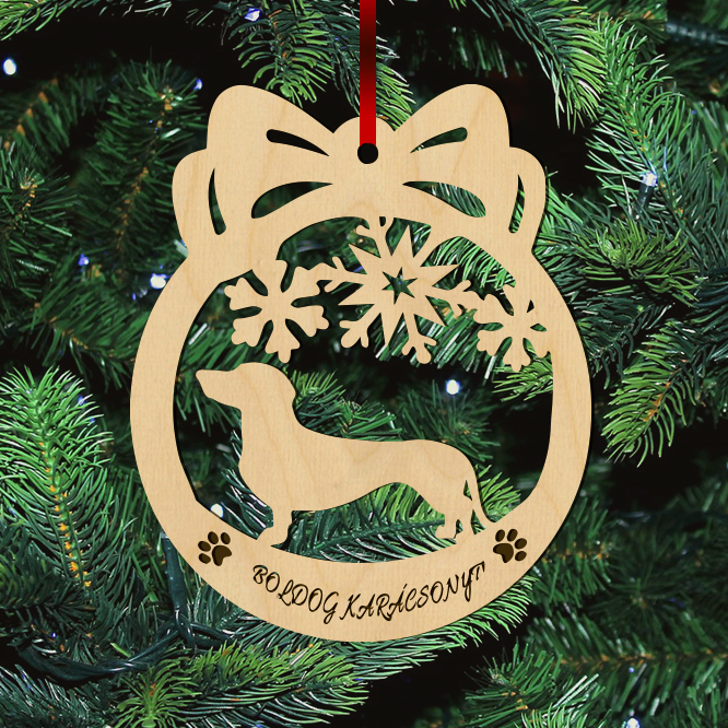 Egy édes kis tacskó gazdájának keresel karácsonyi ajándékot? Íme, a tökéletes ötlet! Ezt a tacskót ábrázoló, „Boldog karácsonyt!” feliratos díszt egyszerűen imádni fogja. A tacskós karácsonyi dísz igazán különlegessé varázsolja a karácsonyi dekorációt, és vidámsággal tölti meg az ünnepi hangulatot. Megajándékozhatod vele szeretteidet, barátaidat vagy kollégáidat, és biztos lehetsz benne, hogy hatalmas örömöt szerezel vele. Bájos, kedves dekorációs ajándék, amellyel azonnal a megajándékozott szívébe lopod magadat. Varázsolj mosolyt szeretteid arcára ezzel a bájos tacskó karácsonyfadísszel.