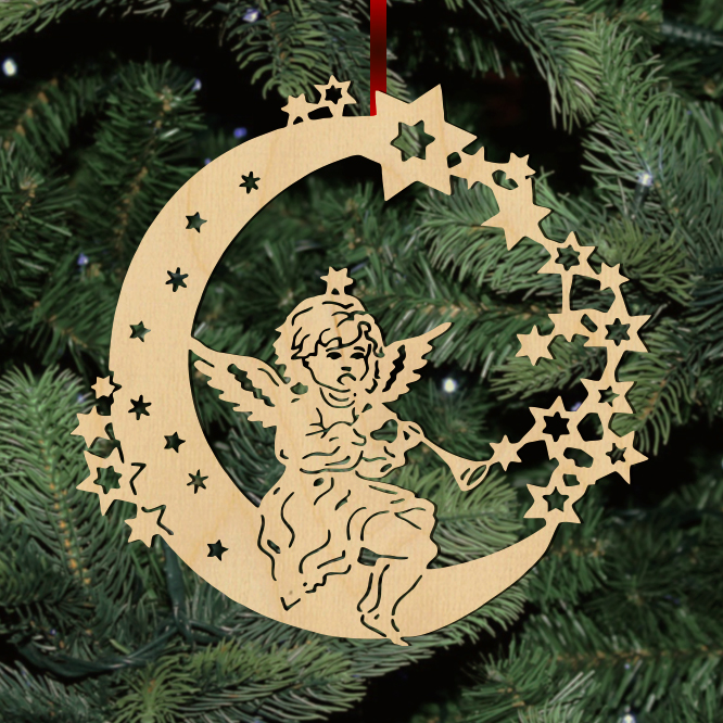 Fa karácsonyfadísz – Zenélő angyal Holdon