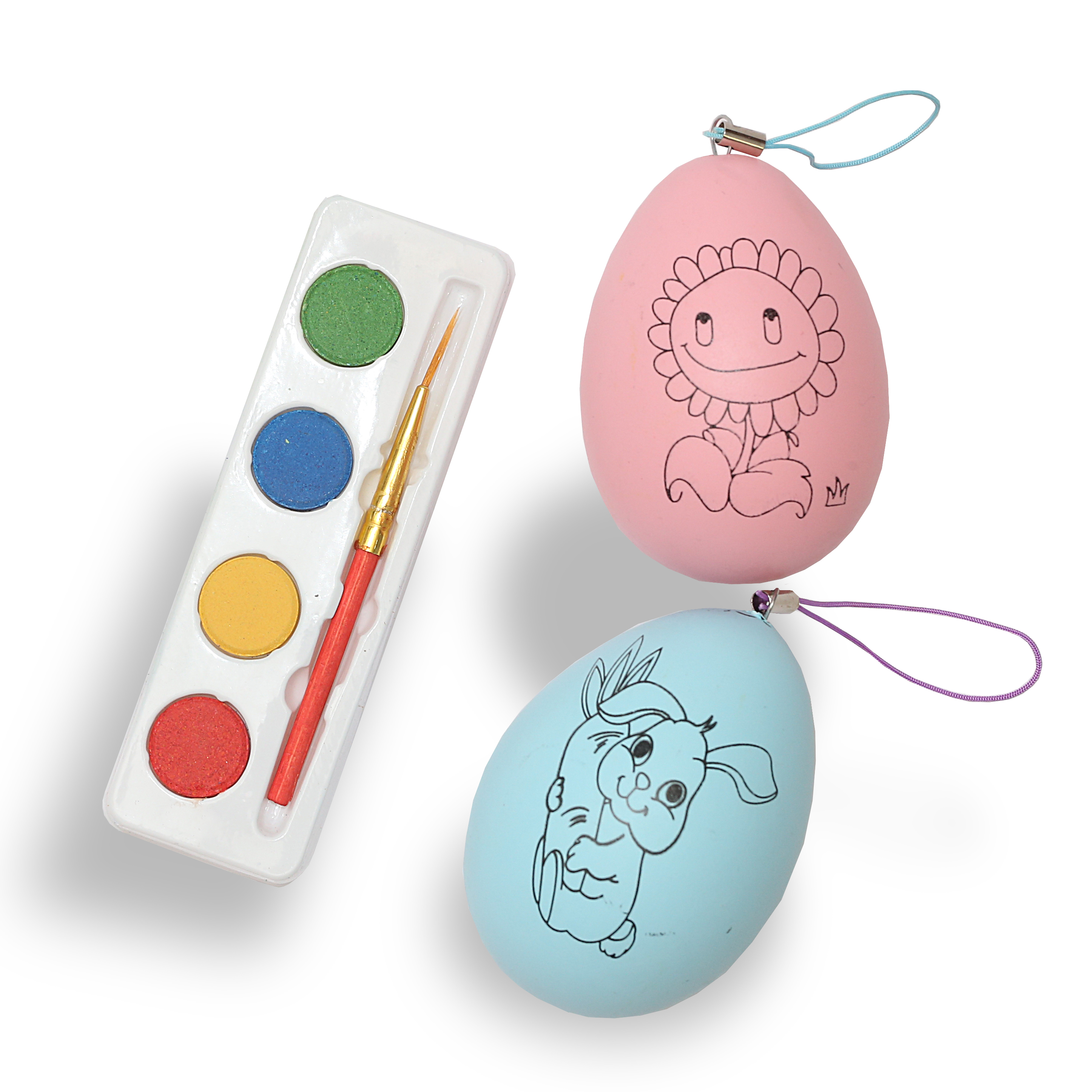 A csomag tartalma: 2 db festhető tojás + 1db négy alapszínt tartalmazó vízfesték + ecset |
