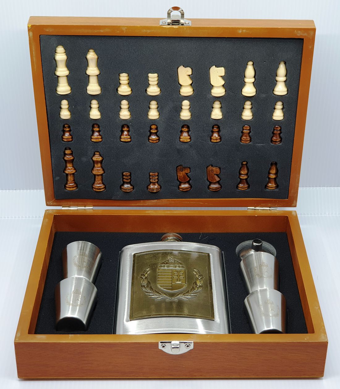 Fantasztikus ajándék ötlet férfiaknak szülinapra, névnapra, karácsonyra! Gyönyörű címeres flaska található a készletben négy darab pohárkával. Így meg tudod kínálni barátaidat kedvenc rövid italoddal! De ezzel nincs vége! A tartó doboz kinyitva átalakul egy sakktáblává. Megtalálhatók benne a picike bábuk is, így kezdetét veheti egy baráti meccs italozással egybekötve, bárhol is jártok! Vidd magaddal utazások alkalmával, kirándulásokra! Az asszonyok menjenek csak vásárolgatni, ti biztos le lesztek kötve ezzel a szuper készlettel!