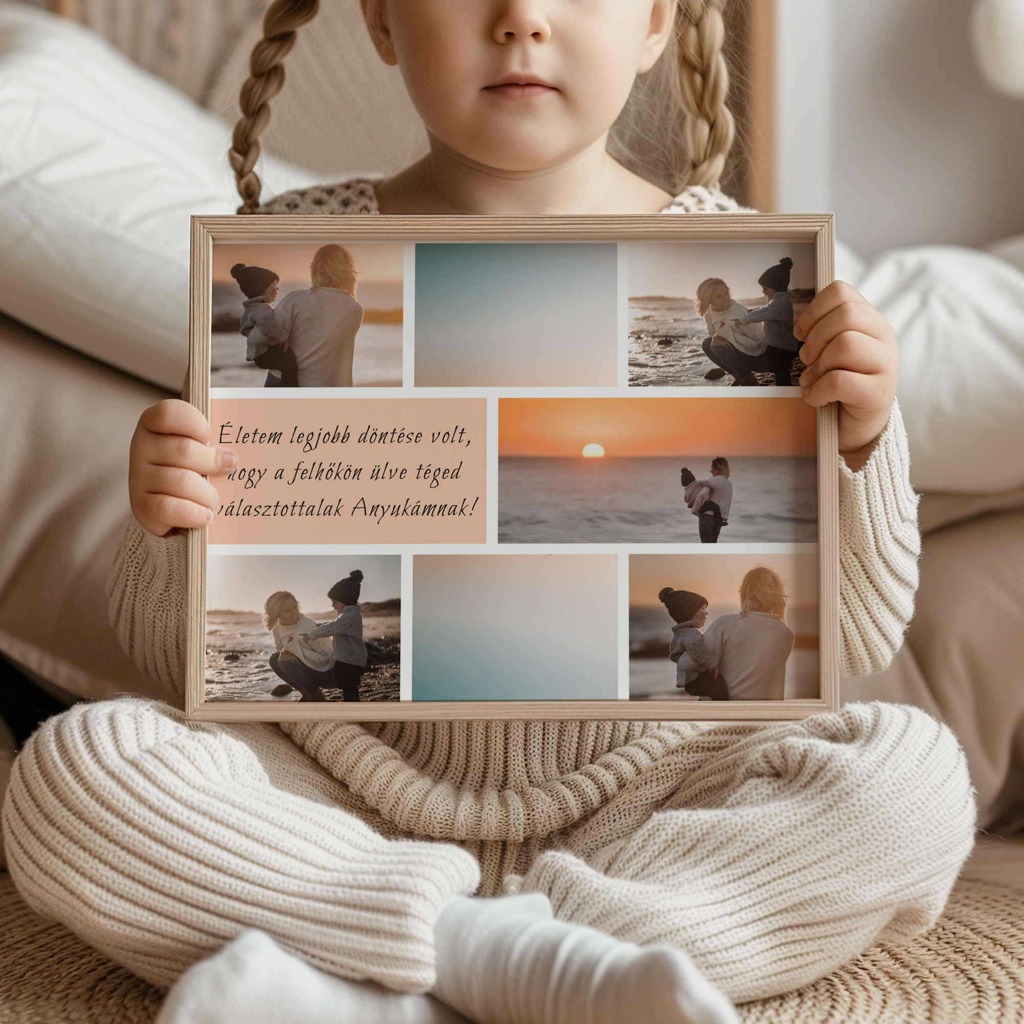 7 db fotót szükséges csatolni a kollázs elkészítéséhez. Ha több képet csatolna, akkor az általunk választott fotók kerülnek a kollázsba. Kérjük, hogy jó minőségű, nagy felbontású képeket töltsenek fel. A gyenge minőségű fotók nem fognak szép, minőségi képet adni, ezek minőségéért mi nem tudunk felelősséget vállalni. A fotó kollázsok mindig prémium minőségű vastag, fényes kartonra készítjük. A képkeretek anyaga fa, és üveg. Képkeretek méretei: A3: belső: 29 x 39,5 cm (külső: 30 x 40 cm.) |