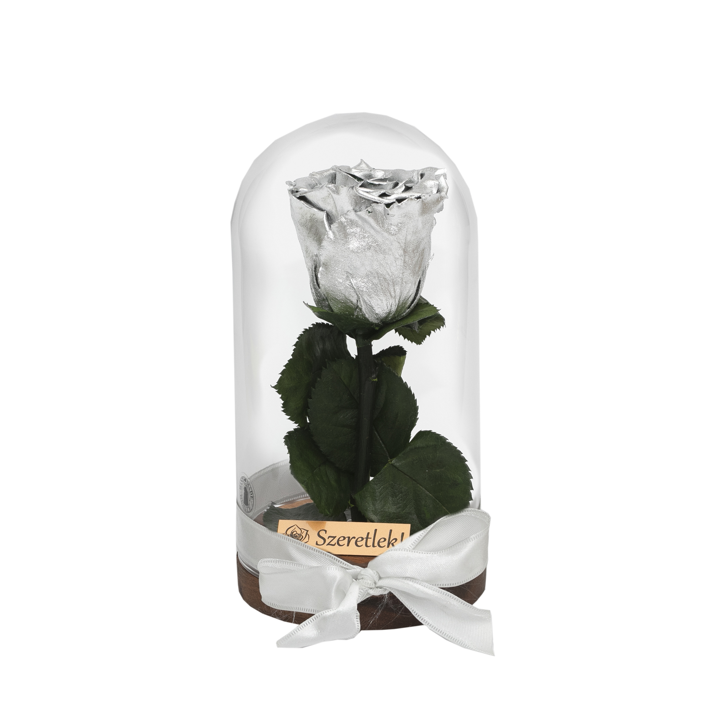 Örökrózsa üvegbúrában - ezüst színű rózsafejjel