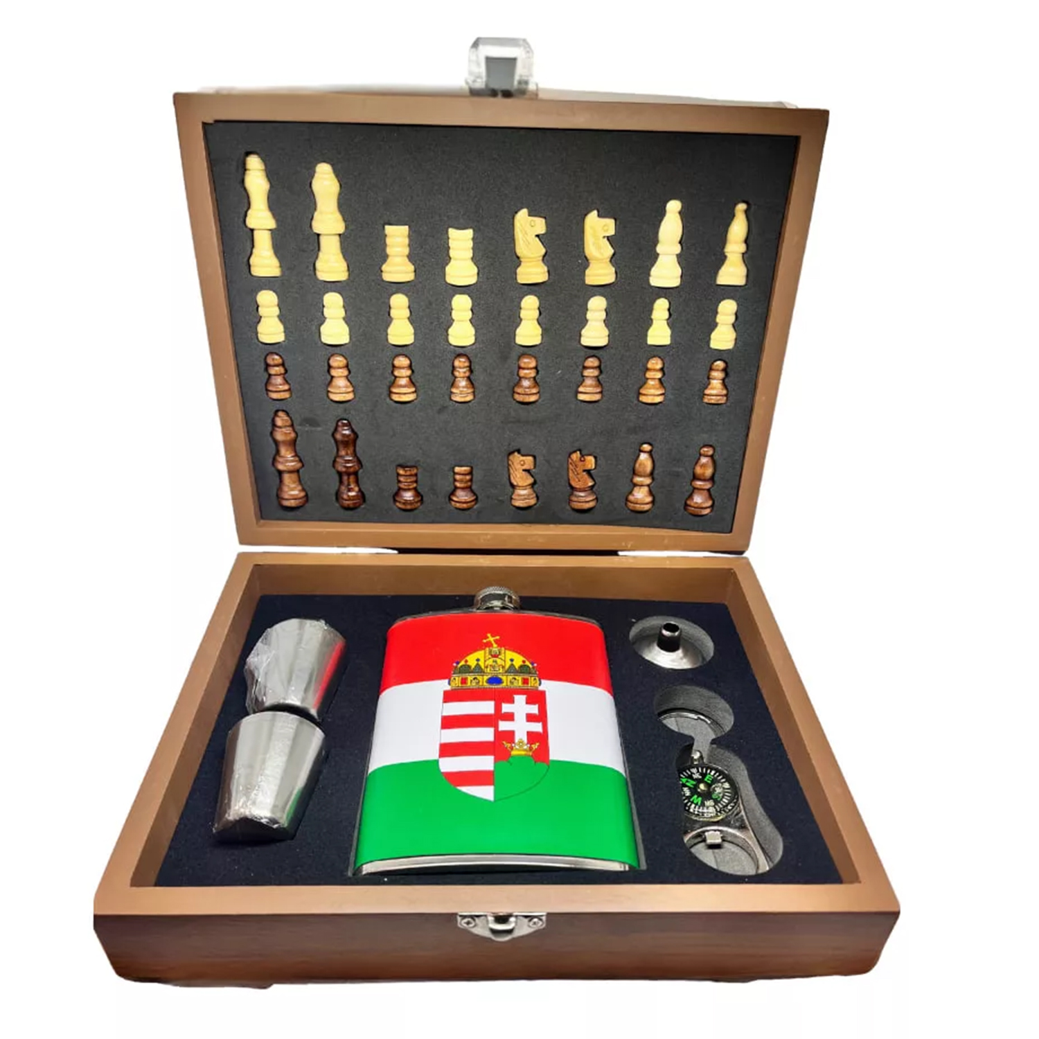 Anyaga: fa, rozsdamentes fém Fadoboz mérete: 24 x 18 x 6cm 1db Flaska űrtartalma: 2dl 2 db pohár űrtartalma: 0,2 c 1 db tölcsér 1db Iránytű mérete: 6cm x 2,5 cm + kulcskarika