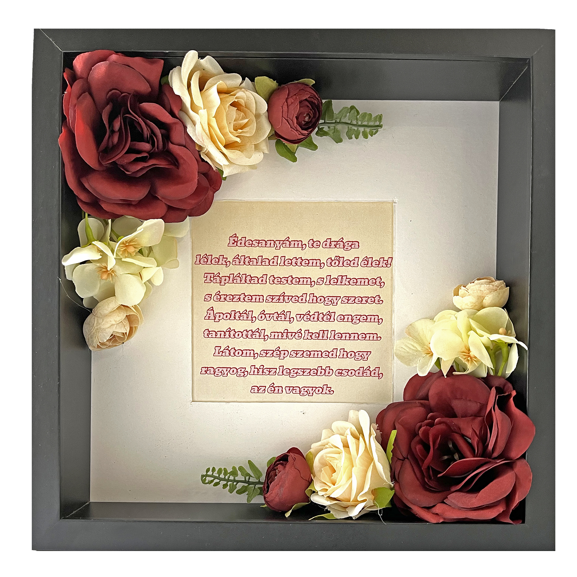 A képkeret mérete: 25 cm X 25 cm A képkeretben található virágok, selyemvirágok. A kép közepén lévő idézet helyére kerül az Ön által megadott egyedi szöveg. Kézműves termék, a virágok színében, fazonjában minimálisan eltérés lehetséges. |