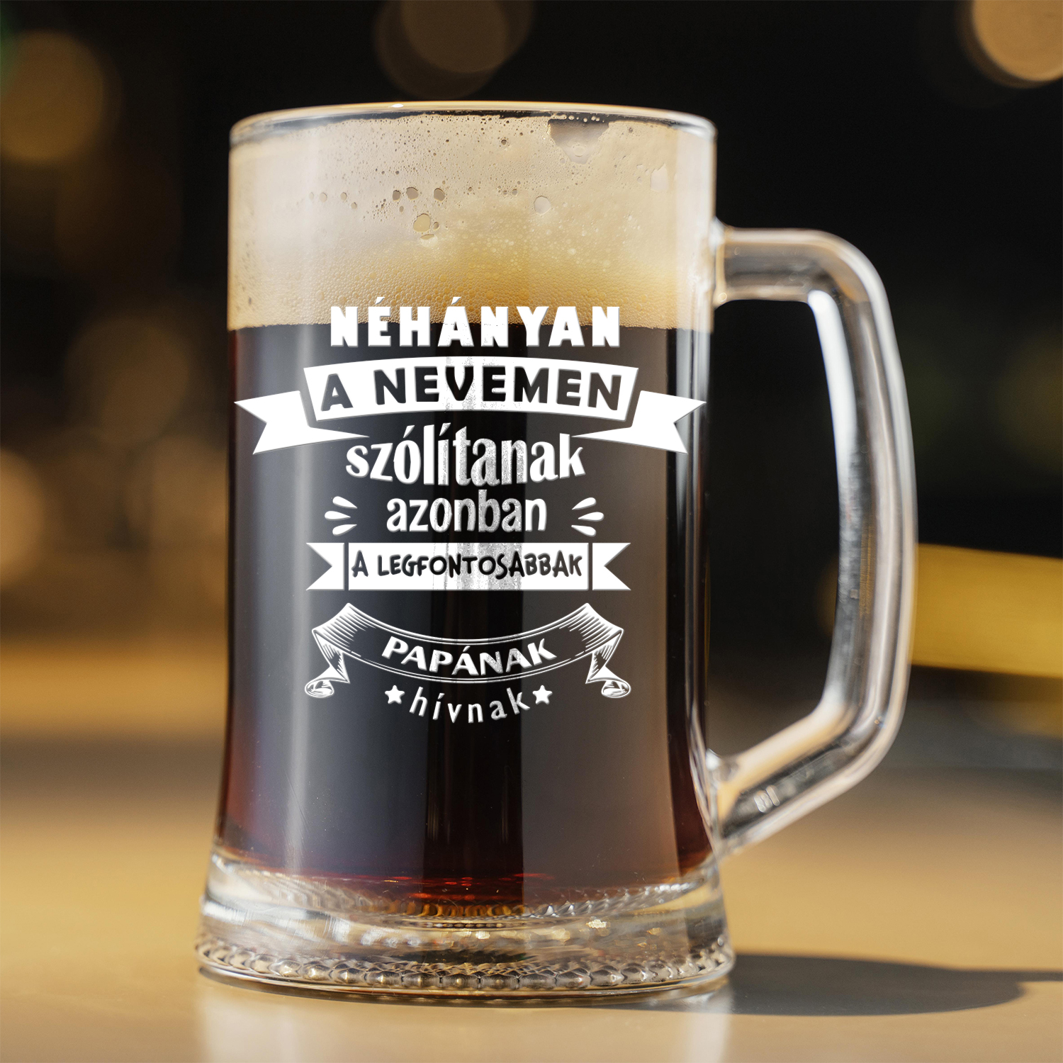 A nagypapák és az unokák kapcsolata igazi csoda. A Papa és a kisunoka különleges kapcsolata tele van önzetlen, tiszta szeretettel. A Papákkal töltött idő móka és vidámság a gyerekeknek. Ha igazán nagy örömöt szeretnél szerezni a nagypapának, akkor ezzel a kedves söröskorsóval leped meg őt. Gravírozás kérésével egyedi, személyre szabott ajándékkal örvendeztetheted meg Apukádat és Apósodat, gyermeked nagypapáit. Minden ünnepre, névnapra, születésnapra, karácsonyra és más jeles alkalomra is tökéletes választás.