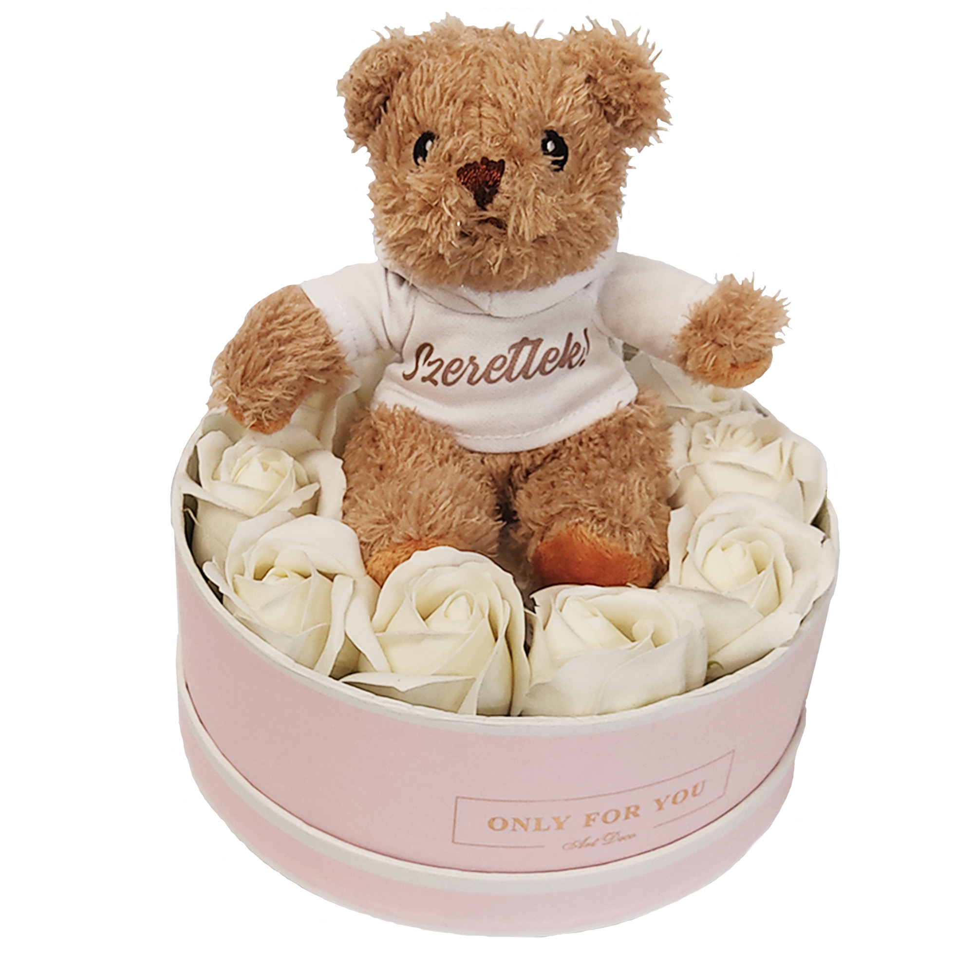 A doboz mérete: 17cm x 7cm; 10db szappan rózsafej A dobozban egy puha plüss anyagból készült mackó. Mérete: 13 cm x 15 cm A Mackó pólójára kérhető felirat: Szeretlek, Szeretettel. A rendelés leadása során írja meg részünkre, hogy melyik felirattal kéri. Alap eseteben a mackót "Szeretlek" feliratú pólóval küldjük. Amennyiben Ön egyedi felirattal szeretné kérni, keresse ügyfélszolgálatunkat.